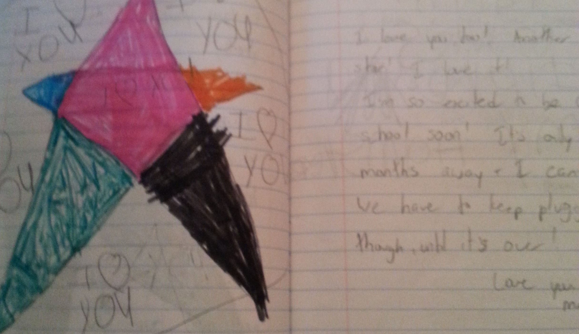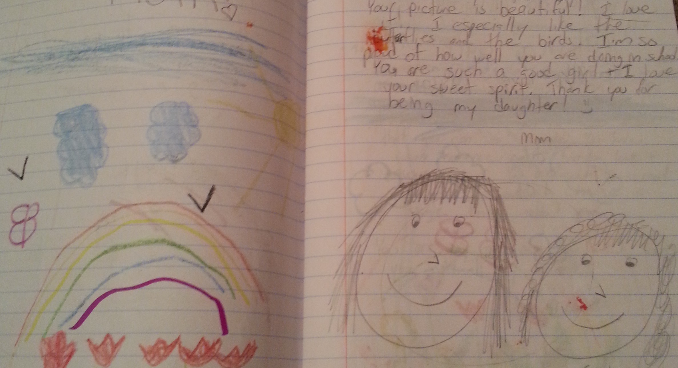 Back when my girls were little, I was keeping a journal about what we did that day. One for each girl. When T started Kindergarten, I thought it would good to get her to journal and practice her letters. (It became a great communication tool for us when she was being bullied, and was too upset to talk about it in person.) Each night I would write a little note, (or draw a picture when they were too little to read) and slip it under their pillow. The next night, after I would leave their rooms, they would write (or draw) a note back to me. Back and forth the notebooks went.